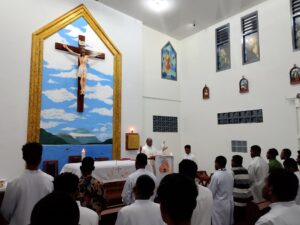KEUSKUPANTIMIKA.ORG – Selasa, 8 September 2025, para Konfrater Keuskupan Timika bersama para pembina rumah studi Tiga Raja merayakan Pesta Kelahiran Santa Perawan Maria dengan penuh sukacita. Perayaan diawali dengan Brevir Kudus pada pukul 18.00 WIT, kemudian dilanjutkan dengan Perayaan Ekaristi di Kapel Tiga Raja yang dipimpin oleh Pastor Yoseph Orokai Ikikitaro.