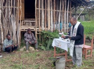 KEUSKUPANTIMIKA.ORG – Pastor Paroki Santo Yosef Enarotali, Keuskupan Timika, RD. Agustinus Alua memberkati Emawa (rumah adat), pagar dan papan nama, Gereja Katolik Stasi Kristus Jaya Utakotopa, Rabu (24/12/2025).